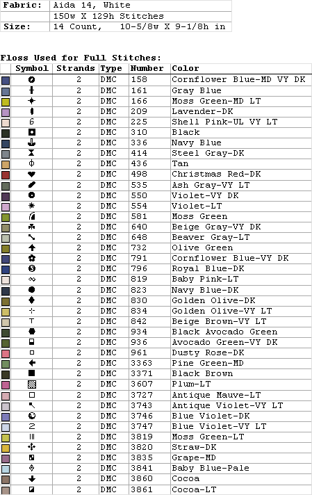 Fabric: Aida 14, White 150w X 129h Stitches Size: 14 Count, 10-5/8w X 9-1/8h in Floss Used for Full Stitches: Type Number Color DMC 158 Cornflower Blue-MD VY DK DMC 161 Gray Blue DMC 166 Moss Green-MD LT DMC 209 Lavender-DK DMC 225 Shell Pink-UL VY LT DMC 310 Black DMC 336 Navy Blue DMC 414 Steel Gray-DK DMC 436 Tan DMC 498 Christmas Red-DK DMC 535 Ash Gray-VY LT DMC 550 Violet-VY DK DMC 554 Violet-LT DMC 581 Moss Green DMC 640 Beige Gray-VY DK DMC 648 Beaver Gray-LT DMC 732 Olive Green DMC 791 Cornflower Blue-VY DK DMC 796 Royal Blue-DK DMC 819 Baby Pink-LT DMC 823 Navy Blue-DK DMC 830 Golden Olive-DK DMC 834 Golden Olive-VY LT DMC 842 Beige Brown-VY LT DMC 934 Black Avocado Green DMC 936 Avocado Green-VY DK DMC 961 Dusty Rose-DK DMC 3363 Pine Green-MD DMC 3371 Black Brown DMC 3607 Plum-LT DMC 3727 Antique Mauve-LT DMC 3743 Antique Violet-VY LT DMC 3746 Blue Violet-DK DMC 3747 Blue Violet-VY LT DMC 3819 Moss Green-LT DMC 3820 Straw-DK DMC 3835 Grape-MD DMC 3841 Baby Blue-Pale DMC 3860 Cocoa DMC 3861 Cocoa-LT