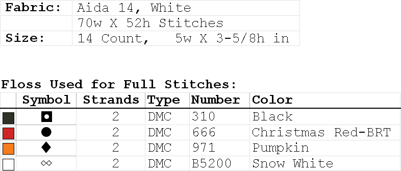 Fabric: Aida 14, White 70w X 52h Stitches Size: 14 Count, 5w X 3-5/8h in Floss Used for Full Stitches: Type Number Color DMC 310 Black DMC 666 Christmas Red-BRT DMC 971 Pumpkin DMC B5200 Snow White