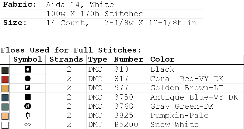 Fabric: Aida 14, White 100w X 170h Stitches Size: 14 Count, 7-1/8w X 12-1/8h in Floss Used for Full Stitches: Type Number Color DMC 310 Black DMC 817 Coral Red-VY DK DMC 977 Golden Brown-LT DMC 3750 Antique Blue-VY DK DMC 3768 Gray Green-DK DMC 3825 Pumpkin-Pale DMC B5200 Snow White