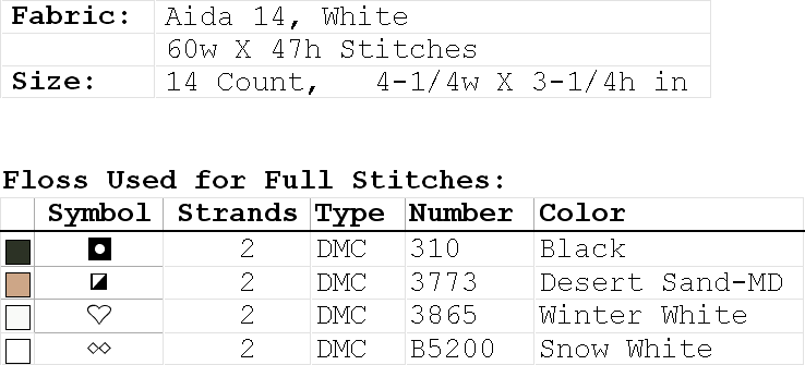 Fabric: Aida 14, White 60w X 47h Stitches Size: 14 Count, 4-1/4w X 3-1/4h in Floss Used for Full Stitches: Type Number Color DMC 310 Black DMC 3773 Desert Sand-MD DMC 3865 Winter White DMC B5200 Snow White