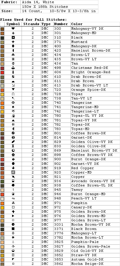 Fabric: Aida 14, White 150w X 188h Stitches Size: 14 Count, 10-5/8w X 13-3/8h in Floss Used for Full Stitches: Type Number Color DMC 300 Mahogany-VY DK DMC 301 Mahogany-MD DMC 310 Black DMC 371 Mustard DMC 400 Mahogany-DK DMC 420 Hazelnut Brown-DK DMC 434 Brown-LT DMC 435 Brown-VY LT DMC 436 Tan DMC 498 Christmas Red-DK DMC 606 Bright Orange-Red DMC 610 Drab Brown-DK DMC 611 Drab Brown DMC 613 Drab Brown-VY LT DMC 720 Orange Spice-DK DMC 728 Topaz DMC 738 Tan-VY LT DMC 740 Tangerine DMC 741 Tangerine-MD DMC 742 Tangerine-LT DMC 780 Topaz-UL VY DK DMC 781 Topaz-VY DK DMC 782 Topaz-DK DMC 783 Topaz-MD DMC 801 Coffee Brown-DK DMC 814 Garnet-DK DMC 829 Golden Olive-VY DK DMC 830 Golden Olive-DK DMC 869 Hazelnut Brown-VY DK DMC 898 Coffee Brown-VY DK DMC 900 Burnt Orange-DK DMC 902 Garnet-VY DK DMC 919 Red Copper DMC 920 Copper-MD DMC 921 Copper DMC 936 Avocado Green-VY DK DMC 938 Coffee Brown-UL DK DMC 945 Tawny DMC 946 Burnt Orange-MD DMC 948 Peach-VY LT DMC 971 Pumpkin DMC 972 Canary-DK DMC 975 Golden Brown-DK DMC 976 Golden Brown-MD DMC 977 Golden Brown-LT DMC 3031 Mocha Brown-VY DK DMC 3371 Black Brown DMC 3776 Mahogany-LT DMC 3782 Mocha Brown-LT DMC 3825 Pumpkin-Pale DMC 3827 Golden Brown-Pale DMC 3829 Old Gold-VY DK DMC 3852 Straw-VY DK DMC 3853 Autumn Gold-DK DMC 3862 Mocha Beige-DK