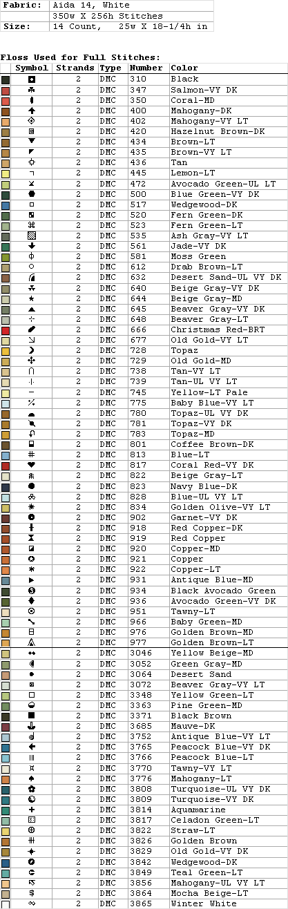 Fabric: Aida 14, White 350w X 256h Stitches Size: 14 Count, 25w X 18-1/4h in Floss Used for Full Stitches: Type Number Color DMC 310 Black DMC 347 Salmon-VY DK DMC 350 Coral-MD DMC 400 Mahogany-DK DMC 402 Mahogany-VY LT DMC 420 Hazelnut Brown-DK DMC 434 Brown-LT DMC 435 Brown-VY LT DMC 436 Tan DMC 445 Lemon-LT DMC 472 Avocado Green-UL LT DMC 500 Blue Green-VY DK DMC 517 Wedgewood-DK DMC 520 Fern Green-DK DMC 523 Fern Green-LT DMC 535 Ash Gray-VY LT DMC 561 Jade-VY DK DMC 581 Moss Green DMC 612 Drab Brown-LT DMC 632 Desert Sand-UL VY DK DMC 640 Beige Gray-VY DK DMC 644 Beige Gray-MD DMC 645 Beaver Gray-VY DK DMC 648 Beaver Gray-LT DMC 666 Christmas Red-BRT DMC 677 Old Gold-VY LT DMC 728 Topaz DMC 729 Old Gold-MD DMC 738 Tan-VY LT DMC 739 Tan-UL VY LT DMC 745 Yellow-LT Pale DMC 775 Baby Blue-VY LT DMC 780 Topaz-UL VY DK DMC 781 Topaz-VY DK DMC 783 Topaz-MD DMC 801 Coffee Brown-DK DMC 813 Blue-LT DMC 817 Coral Red-VY DK DMC 822 Beige Gray-LT DMC 823 Navy Blue-DK DMC 828 Blue-UL VY LT DMC 834 Golden Olive-VY LT DMC 902 Garnet-VY DK DMC 918 Red Copper-DK DMC 919 Red Copper DMC 920 Copper-MD DMC 921 Copper DMC 922 Copper-LT DMC 931 Antique Blue-MD DMC 934 Black Avocado Green DMC 936 Avocado Green-VY DK DMC 951 Tawny-LT DMC 966 Baby Green-MD DMC 976 Golden Brown-MD DMC 977 Golden Brown-LT DMC 3046 Yellow Beige-MD DMC 3052 Green Gray-MD DMC 3064 Desert Sand DMC 3072 Beaver Gray-VY LT DMC 3348 Yellow Green-LT DMC 3363 Pine Green-MD DMC 3371 Black Brown DMC 3685 Mauve-DK DMC 3752 Antique Blue-VY LT DMC 3765 Peacock Blue-VY DK DMC 3766 Peacock Blue-LT DMC 3770 Tawny-VY LT DMC 3776 Mahogany-LT DMC 3808 Turquoise-UL VY DK DMC 3809 Turquoise-VY DK DMC 3814 Aquamarine DMC 3817 Celadon Green-LT DMC 3822 Straw-LT DMC 3826 Golden Brown DMC 3829 Old Gold-VY DK DMC 3842 Wedgewood-DK DMC 3849 Teal Green-LT DMC 3856 Mahogany-UL VY LT DMC 3864 Mocha Beige-LT DMC 3865 Winter White
