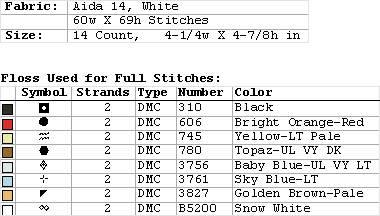 Fabric: Aida 14, White 60w X 69h Stitches Size: 14 Count, 4-1/4w X 4-7/8h in Floss Used for Full Stitches: Type Number Color DMC 310 Black DMC 606 Bright Orange-Red DMC 745 Yellow-LT Pale DMC 780 Topaz-UL VY DK DMC 3756 Baby Blue-UL VY LT DMC 3761 Sky Blue-LT DMC 3827 Golden Brown-Pale DMC B5200 Snow White