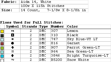 Fabric: Aida 14, White 100w X 115h Stitches Size: 14 Count, 7-1/8w X 8-1/8h in Floss Used for Full Stitches: Type Number Color DMC 307 Lemon DMC 310 Black DMC 747 Sky Blue-VY LT DMC 816 Garnet DMC 907 Parrot Green-LT DMC 964 Sea Green-LT DMC 3846 Bright Turquoise-LT DMC B5200 Snow White
