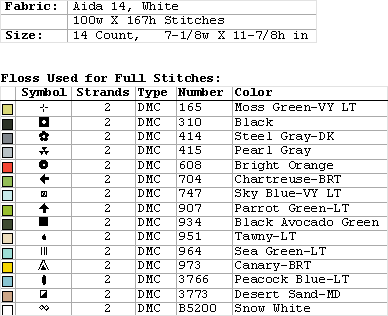Fabric: Aida 14, White 100w X 167h Stitches Size: 14 Count, 7-1/8w X 11-7/8h in Floss Used for Full Stitches: Type Number Color DMC 165 Moss Green-VY LT DMC 310 Black DMC 414 Steel Gray-DK DMC 415 Pearl Gray DMC 608 Bright Orange DMC 704 Chartreuse-BRT DMC 747 Sky Blue-VY LT DMC 907 Parrot Green-LT DMC 934 Black Avocado Green DMC 951 Tawny-LT DMC 964 Sea Green-LT DMC 973 Canary-BRT DMC 3766 Peacock Blue-LT DMC 3773 Desert Sand-MD DMC B5200 Snow White