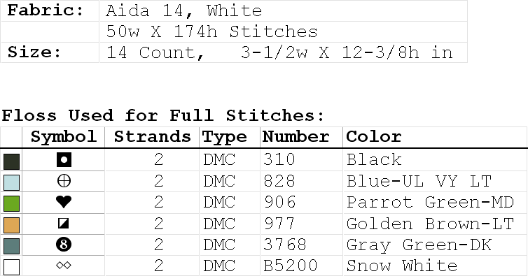 Fabric: Aida 14, White 50w X 174h Stitches Size: 14 Count, 3-1/2w X 12-3/8h in Floss Used for Full Stitches: Type Number Color DMC 310 Black DMC 828 Blue-UL VY LT DMC 906 Parrot Green-MD DMC 977 Golden Brown-LT DMC 3768 Gray Green-DK DMC B5200 Snow White
